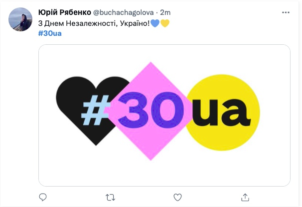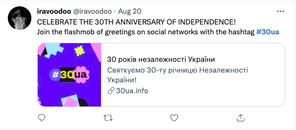 Долучайся до флешмобу привітань в соцмережах з гештегом #30ua. Пропонуй ідеї досягнень України та відмічай нашу інста-сторінку @30ua.info у сторіз і вони з’являться на нашому сайті!